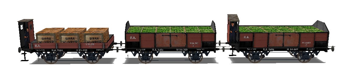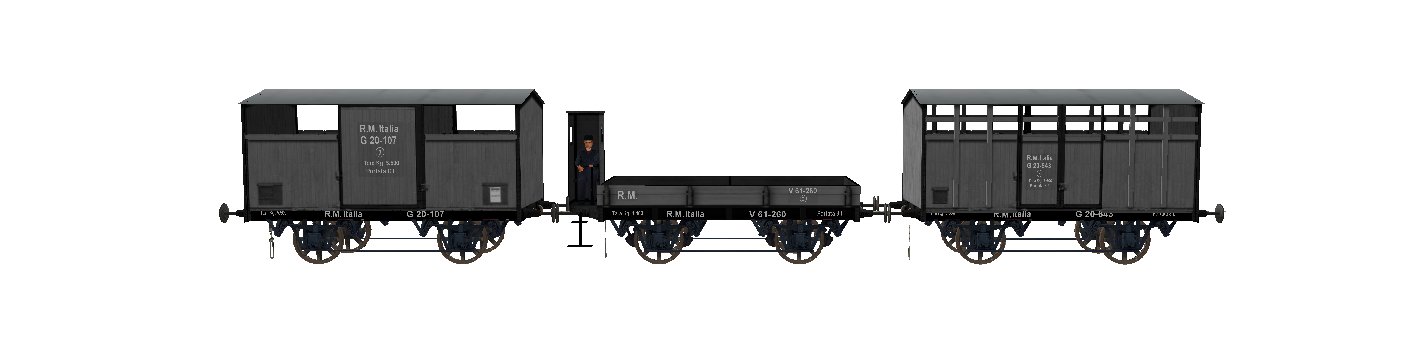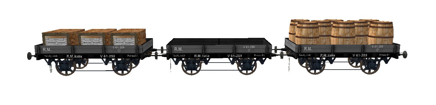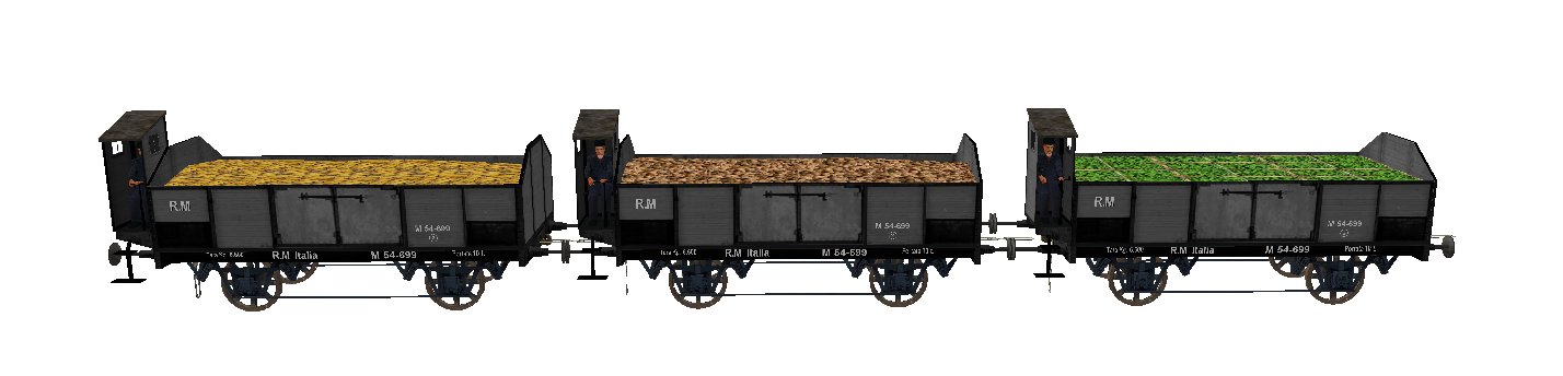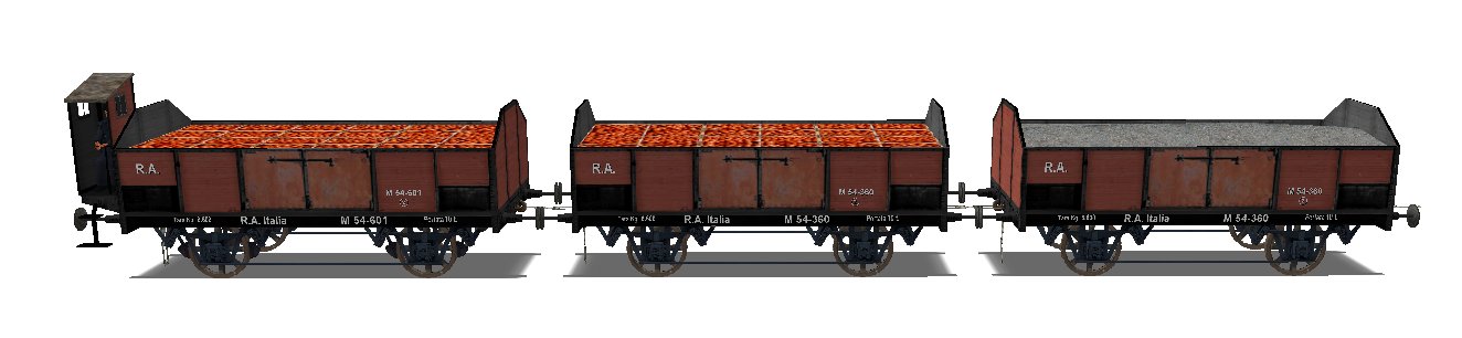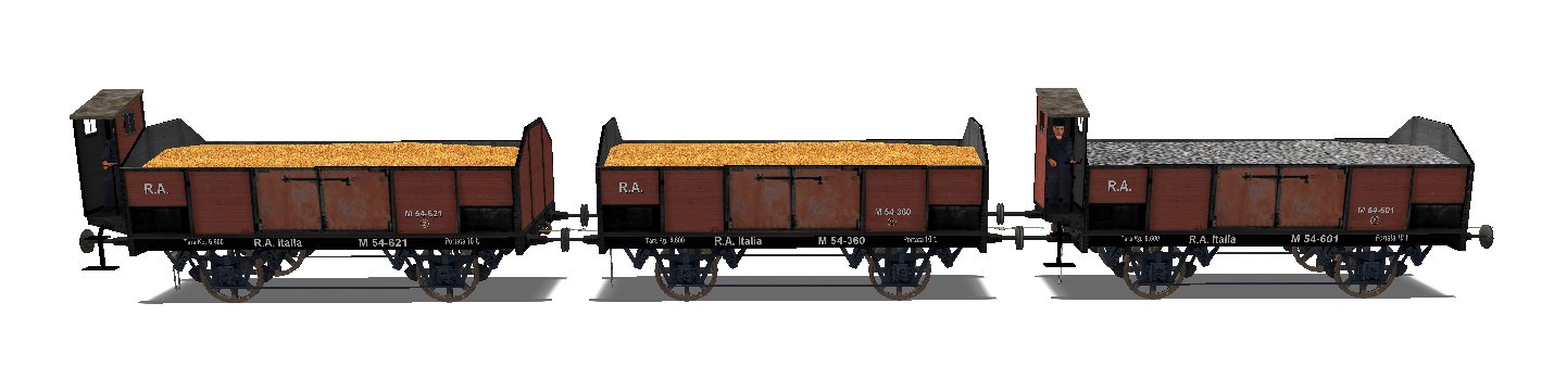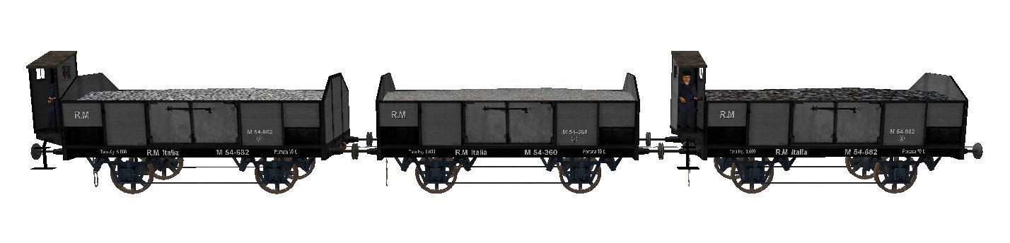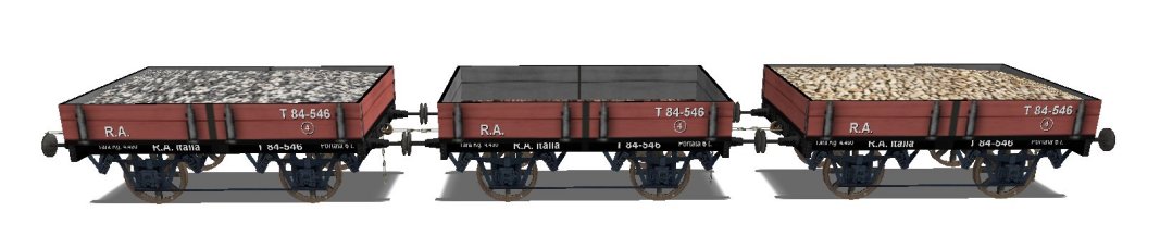 Carri tipo T per trasporto ghiaia, erano utilizzari per il trasporto del pietrisco per la massicciata dei binari. Seguiranno i carri caichi di traverse, di ferramenta e di binari in modo da poter riprodurre i cantieri.