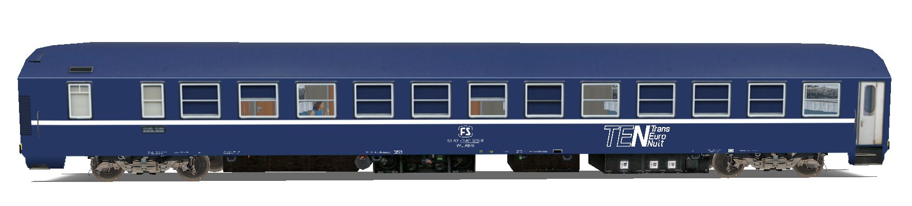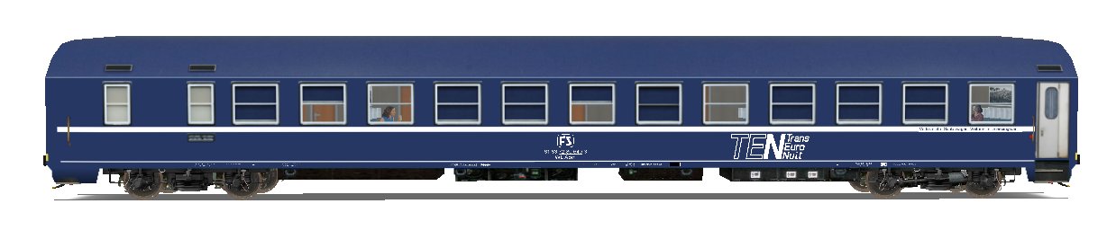 Vettura M TEN delle FS, con carrelli tipo L e carenatura sottocassa.