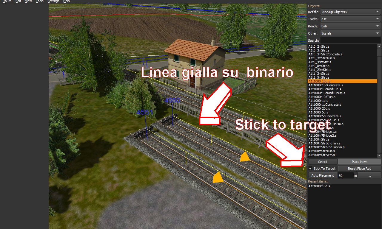 Posted - 31/03/2024 : 11:55:00 Ciao a tutti, come indicato da Massimo devi assicurarsi che il binario sia caricato nel track data base (TDB), ovvero se c'è la linea gialla sopra il binario, e devi andare molto vicino alla fine del binario per poterlo collegare a quello già posato. Se non c'è la liena gialla, devi selezionare il binario e premere il tasto "z". Con questo tasto inserisci e togli i binari dal TDB. Oltre a questo puoi forzare il binario (o qualsiasi altro oggetto) ad allinearsi ed agganciarsi ad una strada o un binario già posati selezionando la casella "Stick to Target" come nella immagine sotto.