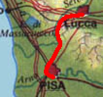 sud fiancheggiando il fiume Serchio ed attraversando gli abitati di Ripafratta, Rigoli e Bagni di San Giuliano dove, con una stretta curva verso destra,