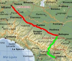 La Milano-Bologna in tale periodo era divisa tra le due società, si partiva da Milano con la Mediterranea, si proseguiva fino a Piacenza o a Parma e si arrivava a Bologna con l’Adriatica.